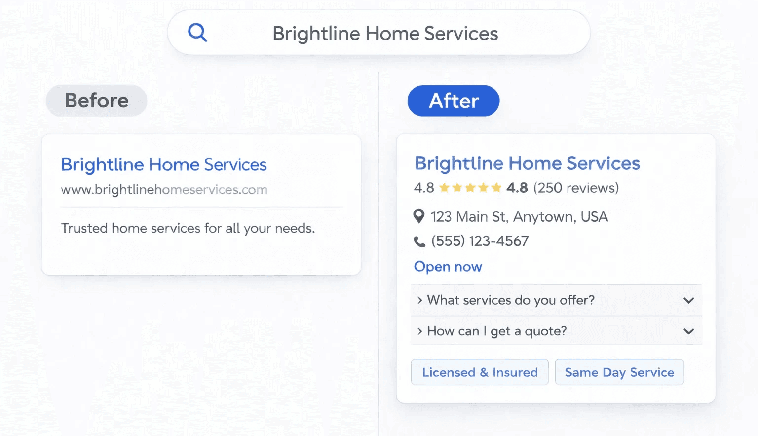 Not all search listings look the same. When your business is clearly structured, your listing can display more information and take up more space. When it isn’t, it stays basic. Here’s the difference.