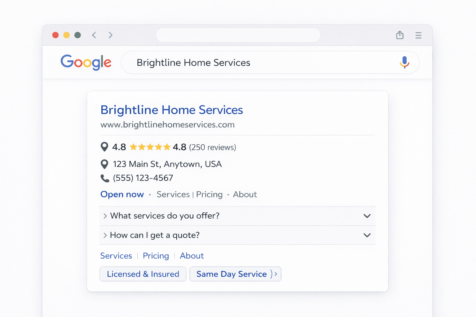 When your site is structured properly, your listing can display richer information like reviews, FAQs, and stronger business details.
